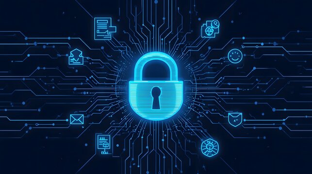 This image represents the concept of digital security with a glowing padlock at the center, surrounded by various icons that symbolize data protection and cyber security. Xenic