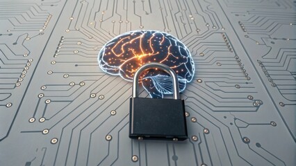A digital image of a brain with circuitry, secured by a padlock, symbolizing data protection and cybersecurity in modern technology.