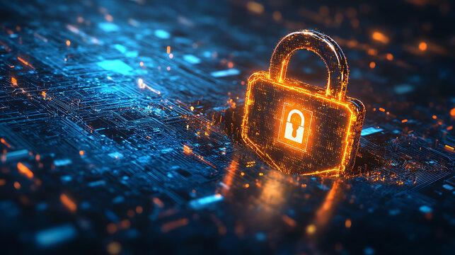 Digital cybersecurity concept with glowing lock and circuitry