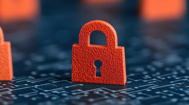 Modern digital security concept featuring vibrant orange padlocks on a dark circuit background, symbolizing cybersecurity and data protection visually engagingly