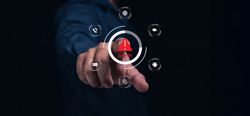 Cyber security alert concept with warning symbol over businessman using laptop. Digital data protection, online banking risk, hacking threat, malware, phishing attack and information security breach