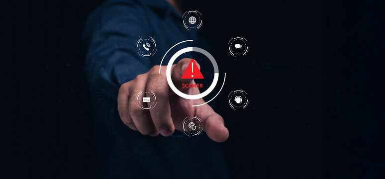 A hand points at a warning symbol on a digital interface, indicating a potential cybersecurity threat or alert.