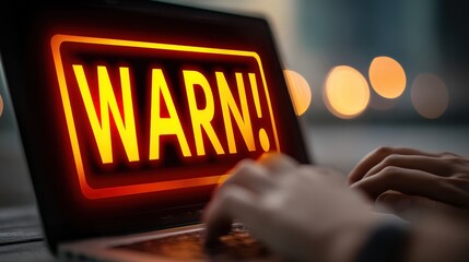 A person types on a laptop displaying a bright "WARN!" sign, indicating a sense of urgency or alertness in a digital context.