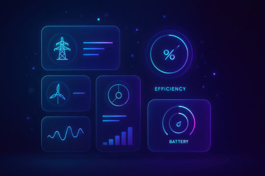 Predictive maintenance dashboard displays efficiency metrics and battery status with vibrant graphics for enhanced data visualization
