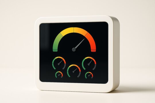 Abstract dashboard gauge interface with colorful performance meters on modern digital display device against light background concept visualization. Ai generative