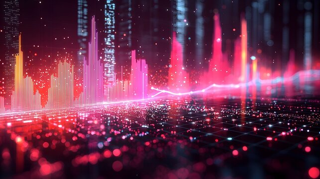 Futuristic data visualization with glowing bar charts and digital dots