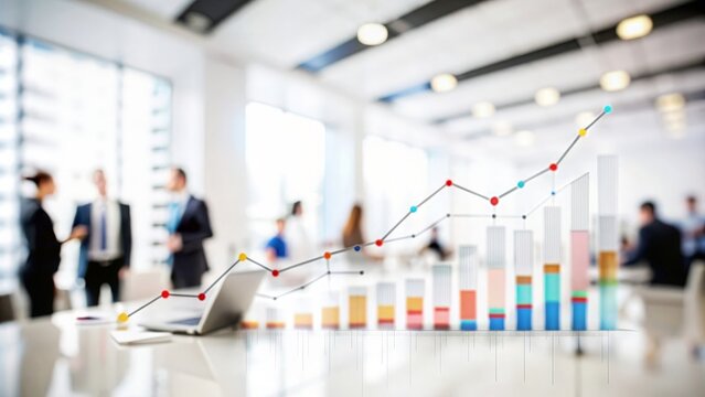 Global financial trading chart with glowing blue bars and world map on digital interface background illustrating business data and economy concept. Ai generative