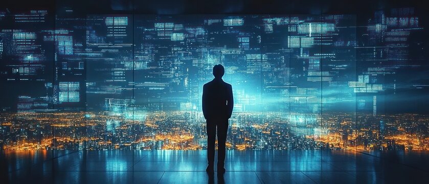 A business professional checks their smartphone amidst vibrant digital data visualizations over a modern city skyline at dusk, embodying innovation and technology. Xenic