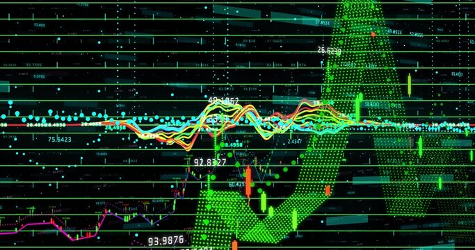 Digital stock market graph with red and green up and down arrow
