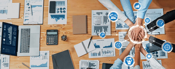 Aerial view of teamwork in a modern office, showing hands together over charts and graphs, illustrating collaboration and strategic planning in a professional workspace. Amity