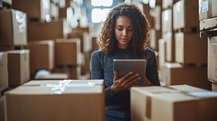 Focused businesswoman utilizing a tablet to oversee inventory among neatly stacked boxes in a busy warehouse. The scene conveys modern entrepreneurship and efficiency