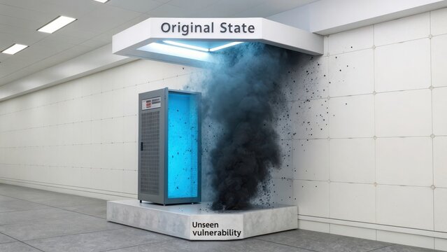 Server in Original State faces unseen vulnerability represented by dark cloud and particles
