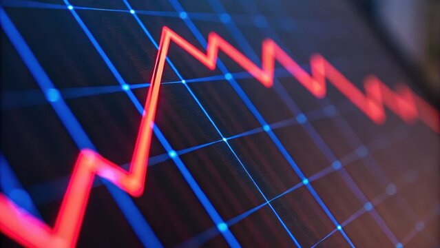 Red and blue graph line depicting market trends on a digital screen with grid background, representing data analysis and economic fluctuations.