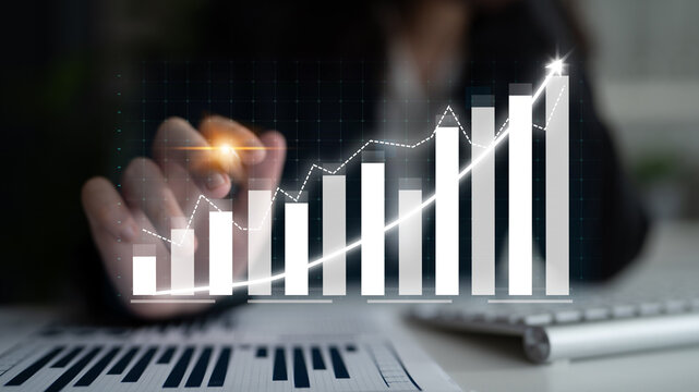 A modern business scene showcasing hand gestures over a rising graph, illustrating growth and success in finance and analytics. Ideal for corporate projects. Impute