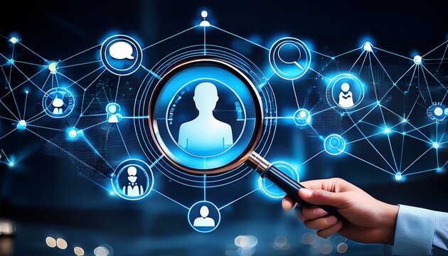 a magnifying glass over digital user icons and connections symbolizing data analysis