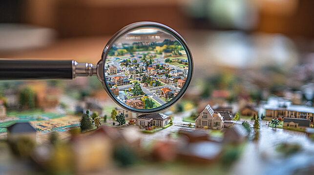 A magnifying glass over a map of a busy neighborhood, highlighting a house in an urban neighborhood