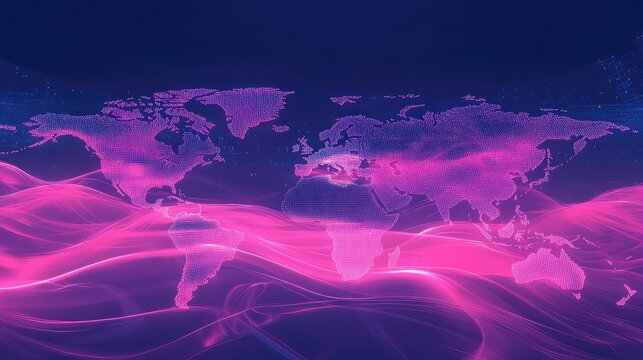 Digital world map composed of glowing dots, illustrating global technology, communication, and interconnectedness over a dynamic background of vibrant pink and purple light waves