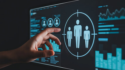 Hand interacting with a futuristic digital interface displaying human figures within a target scope and data analytics