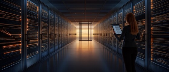 A woman monitors training clusters from within a high-tech data center, analyzing multiple dashboards as blue LED lights illuminate the space and advanced cooling systems support the GPUs