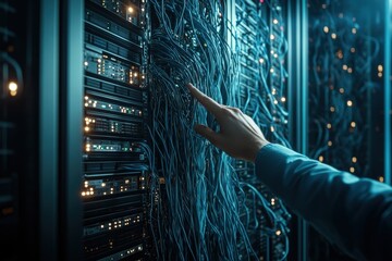 A close-up view of a hand reaching towards densely packed server racks, showcasing the intricate network of cables and illuminated indicators, symbolizing the complexity of modern technology.