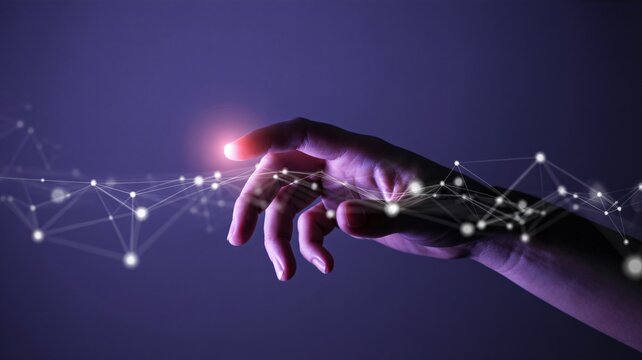 Big Data concept. Digital neural network.Business woman hand touching Introduction of artificial intelligence. Cyberspace of future.Science and innovation of technology.