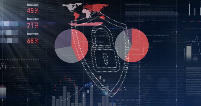 Displaying dotted shield with padlock on security dashboard, with world map, pie and bar charts