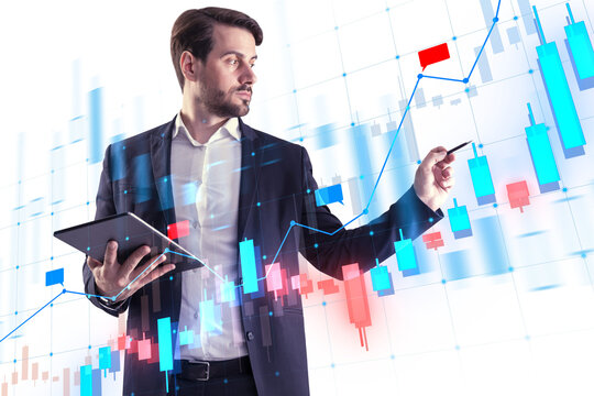 A businessman analyzing digital financial charts, holding a tablet, with a futuristic interface overlay on top