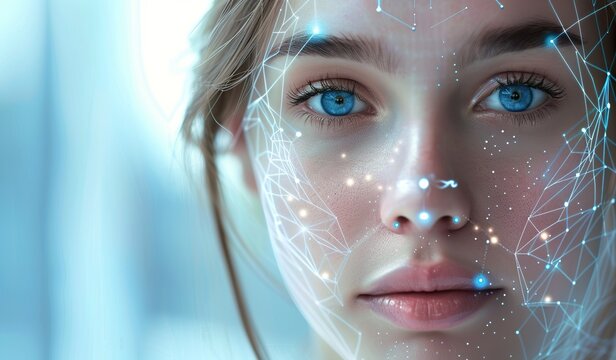 A female face with digital markers on a blue background. The concept of cybernetics and artificial intelligence.