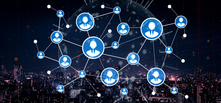This image showcases a digital network concept featuring icons representing people interconnected over a vibrant city skyline at night, emphasizing technology and communication. Tessel