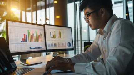 Businessman analyzing global market indexes in modern office setting for financial strategy planning