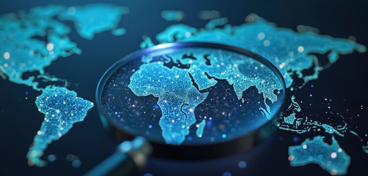 Magnifying glass over glowing digital network map of world. Data analysis, research, information concept. Technology, science, innovation, cyberspace, web, online. Global communication, connection,