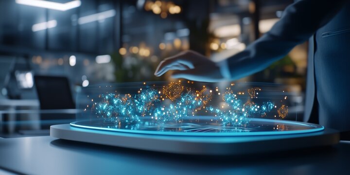 Modern office interior featuring businessman manipulating holographic data interface, hovering hand over glowing interconnected digital network projection