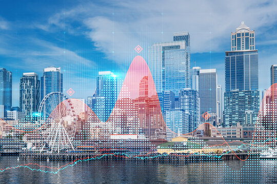 Financial data overlay on modern USA cityscape with digital stock market chart concept in urban background against blue sky and waterfront buildings.