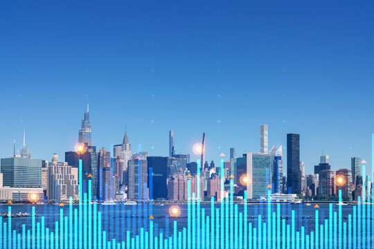 Urban skyscrapers with a double exposure of glowing financial graphs, in a concept of market analysis on a blue background