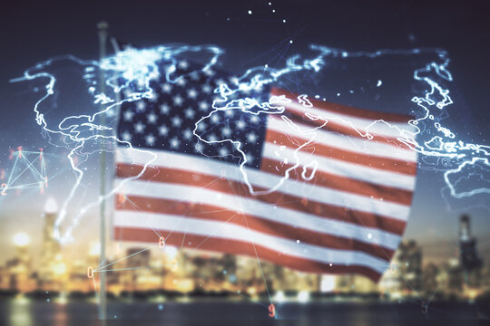 Double exposure of abstract digital world map hologram with connections on USA flag and blurry cityscape background, research and strategy concept