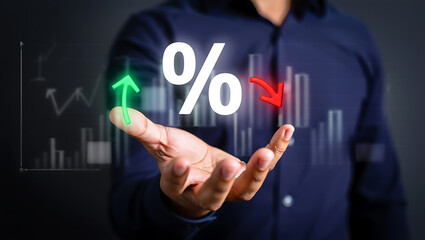 Hand holding percentage sign with upward and downward arrows and financial charts upward arrow green arrow