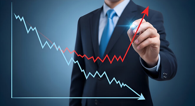 Businessman in suit draws a rising red arrow over a declining blue line graph symbolizing financial recovery and positive market trend analysis