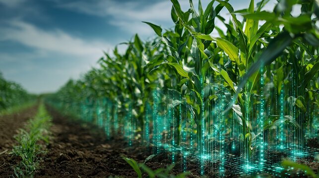 Cornfield with digital data overlay represents precision agriculture and technology-driven farming systems for efficient food production.