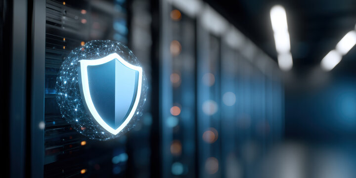 digital shield icon hovering over a dark server rack in a data center, visualizing data protection