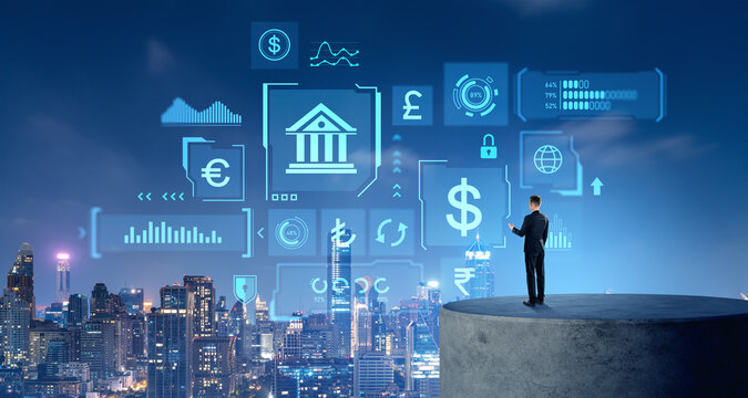 Businessman on a concrete platform, central bank digital currency dashboard