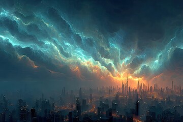 Smart city with abstract dot connections and flowing gradient lines, representing big data and advanced technology concepts