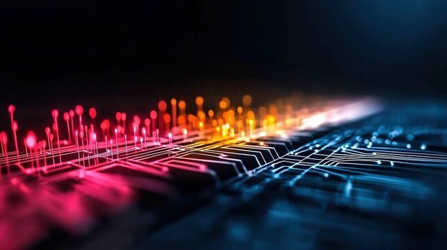 defocused digital interface displaying neon circuit paths and glowing nodes