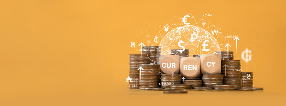 International currencies around the world Online interbank payment concept Stack of coins arranged with wooden blocks bearing the word Dong and currency symbols including the dollar, euro, yen