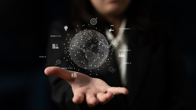 Global business network connecting digital economy and data exchange. Global business expands market, business shares data, global drives finance, and global business supports insight. Latch