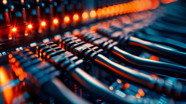 A close-up image showcasing the intricate network of cables connecting a server rack, illuminated by glowing lights, symbolizing the flow of data and information
