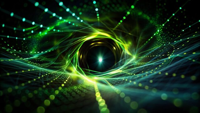 green background illustrating data transmission, digital processing. It features glowing electronic circuit lines, light streaks, bokeh points moving diagonally, symbolizing technology, AI, computing.