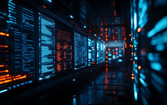 Futuristic server room with digital data and holographic displays