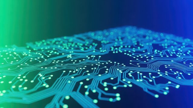 Close-up of a futuristic circuit board with glowing green lights. Abstract technology background showing data processing on a computer motherboard. Artificial intelligence and cyber innovation concept