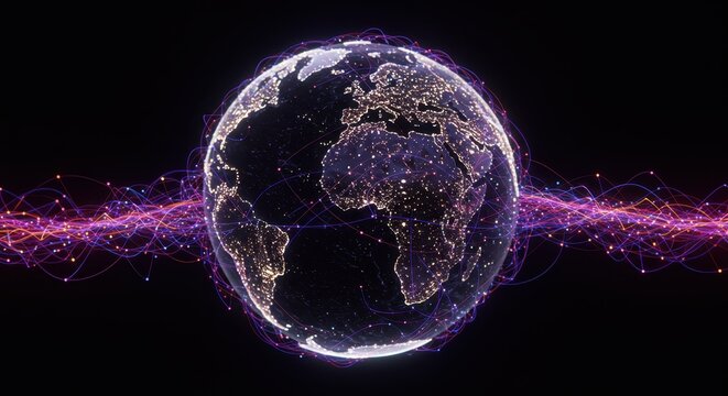 Illuminated terrestrial sphere displays complex global data transmission streams against a dark background