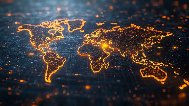Digital glowing world map shows global data network lines. Futuristic continents with bright light points depict international connections and information flow.